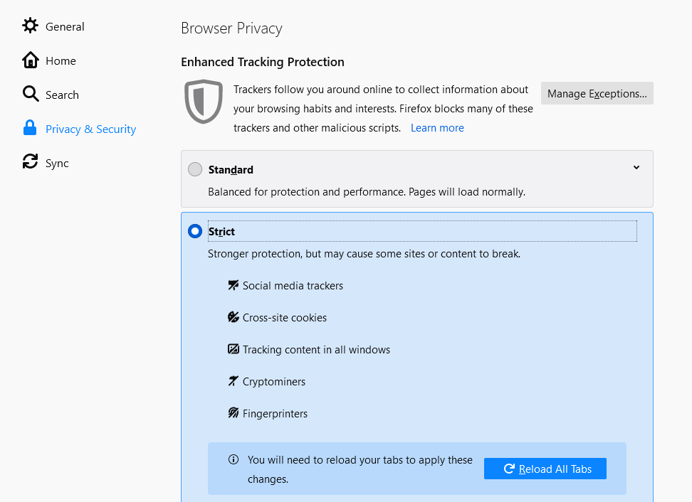 Navigate to “Privacy & Security” and under Enhanced Tracking Protection, select “Strict”. Note that if websites are missing content, or features, revert to “Standard” to restore functionality.